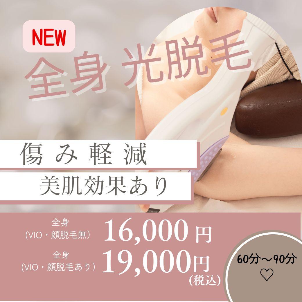 お肌にやさしい光で、全身をつるんと美肌に✨ 毛質・肌質を問わず、白い毛にも対応。 痛みをほとんど感じない脱毛で、敏感肌の方にも安心です。 ムダ毛ケアと同時にお肌のキメを整え、透明感のあるなめらかな素肌へ導きます🌸顔・VIOを含む全身を丁寧にケアする、贅沢なフルコース✨ では、デリケートな部分も、やさしい光で痛みを感じにくく安心。 お顔脱毛ではうるおいと透明感がアップし、すっぴんにも自信が持てるお肌へ💖 「全身まるごとキレイになりたい方」におすすめです🌿