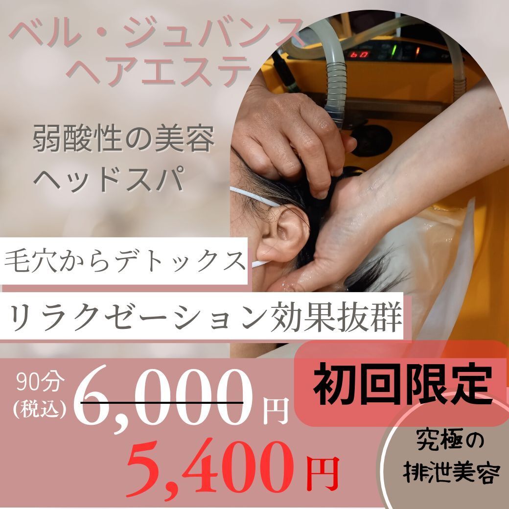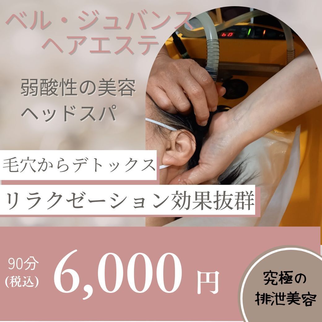 弱酸性の美容法ベル・ジュバンスのヘアエステです。頭皮の毛穴から徹底的に老廃物を取り除くリラクゼーションエステです。髪も頭皮も引き締め、髪が育つ土壌である頭皮を毛穴からリフレッシュ!pHを整え、弱酸性にすることによりハリや透明感を出し、健康的な地肌を保ちます。